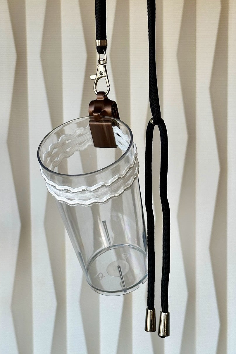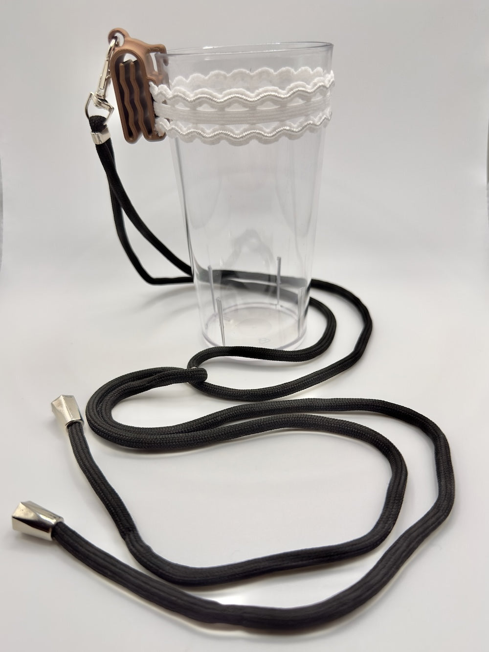Deze Clip A Cup wordt geleverd met een bijpassend keykoord van flexibel koord. Je kunt hem om je nek dragen, maar omdat hij verstelbaar is, kun je hem ook over je schouder dragen!