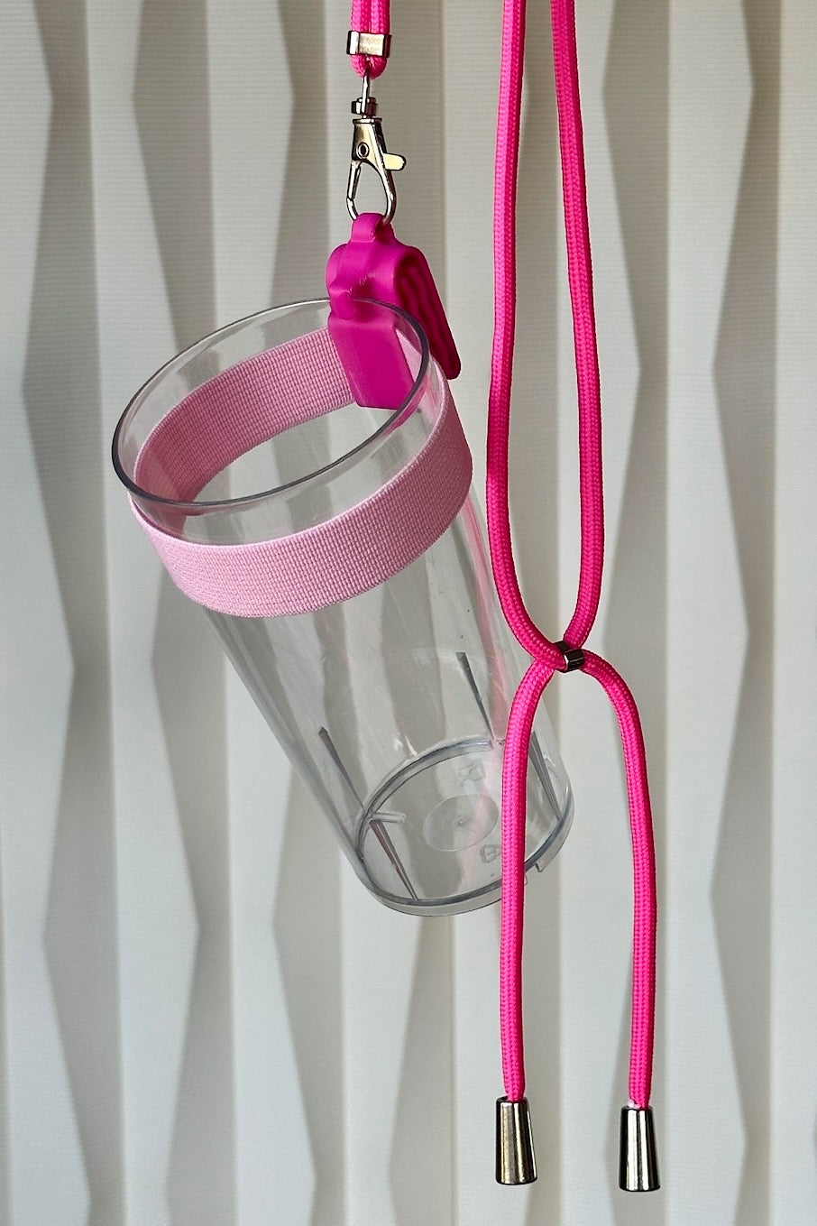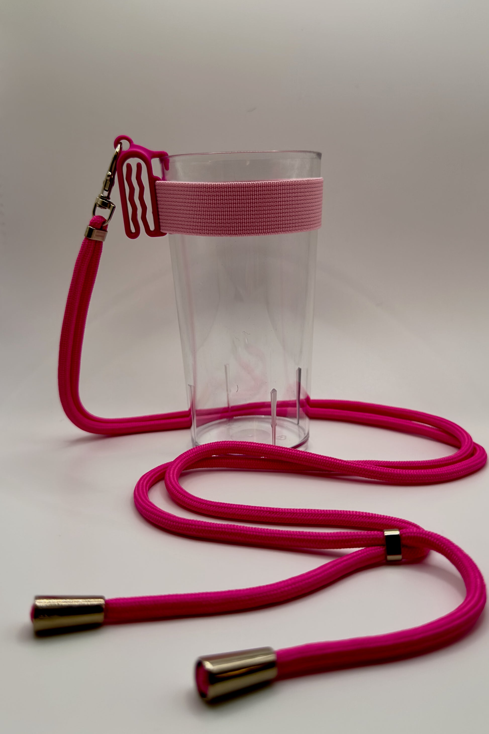 Deze Clip A Cup wordt geleverd met een bijpassend keykoord van flexibel koord. Je kunt hem om je nek dragen, maar omdat hij verstelbaar is, kun je hem ook over je schouder dragen!