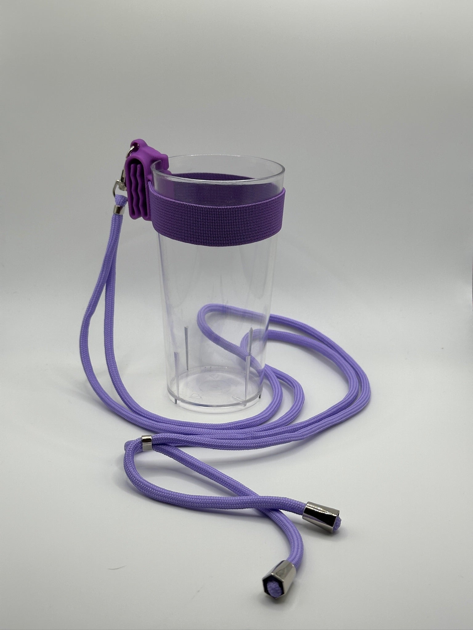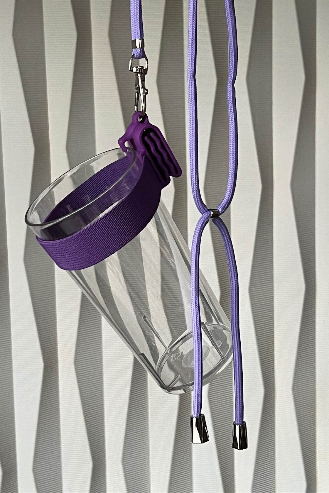 Deze Clip A Cup wordt geleverd met een bijpassend keykoord van flexibel koord. Je kunt hem om je nek dragen, maar omdat hij verstelbaar is, kun je hem ook over je schouder dragen!