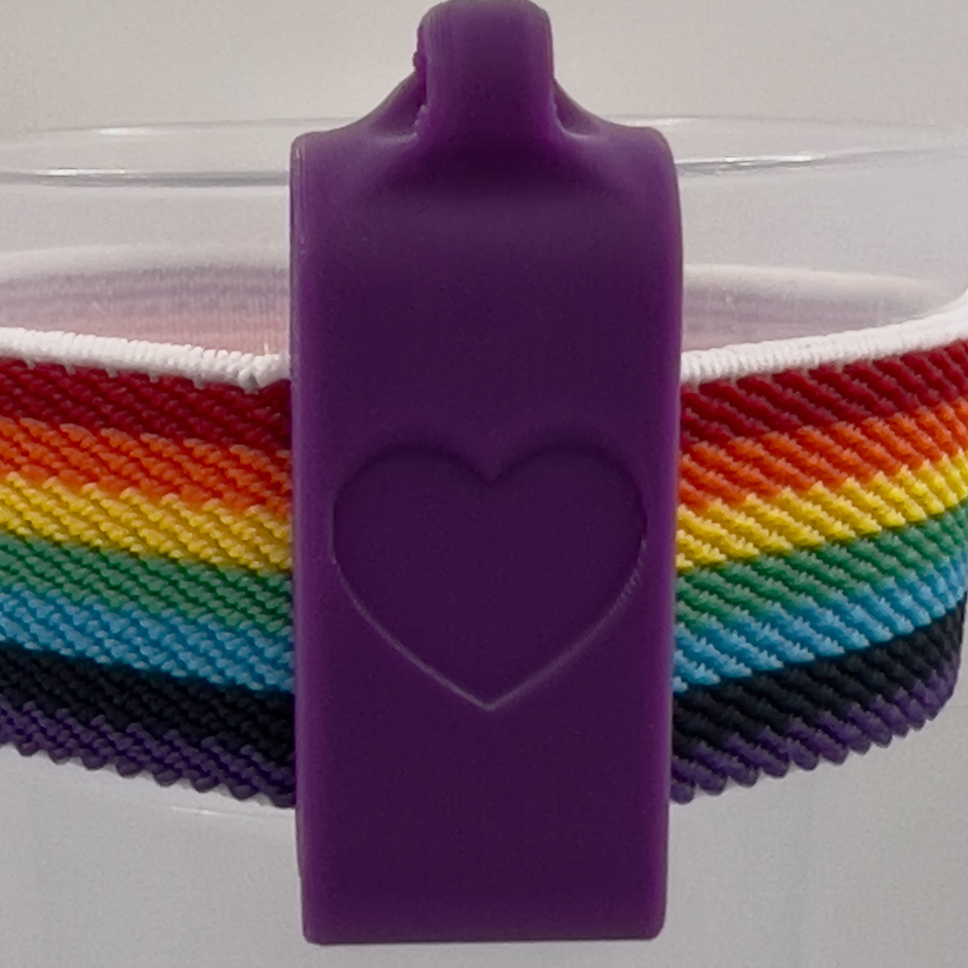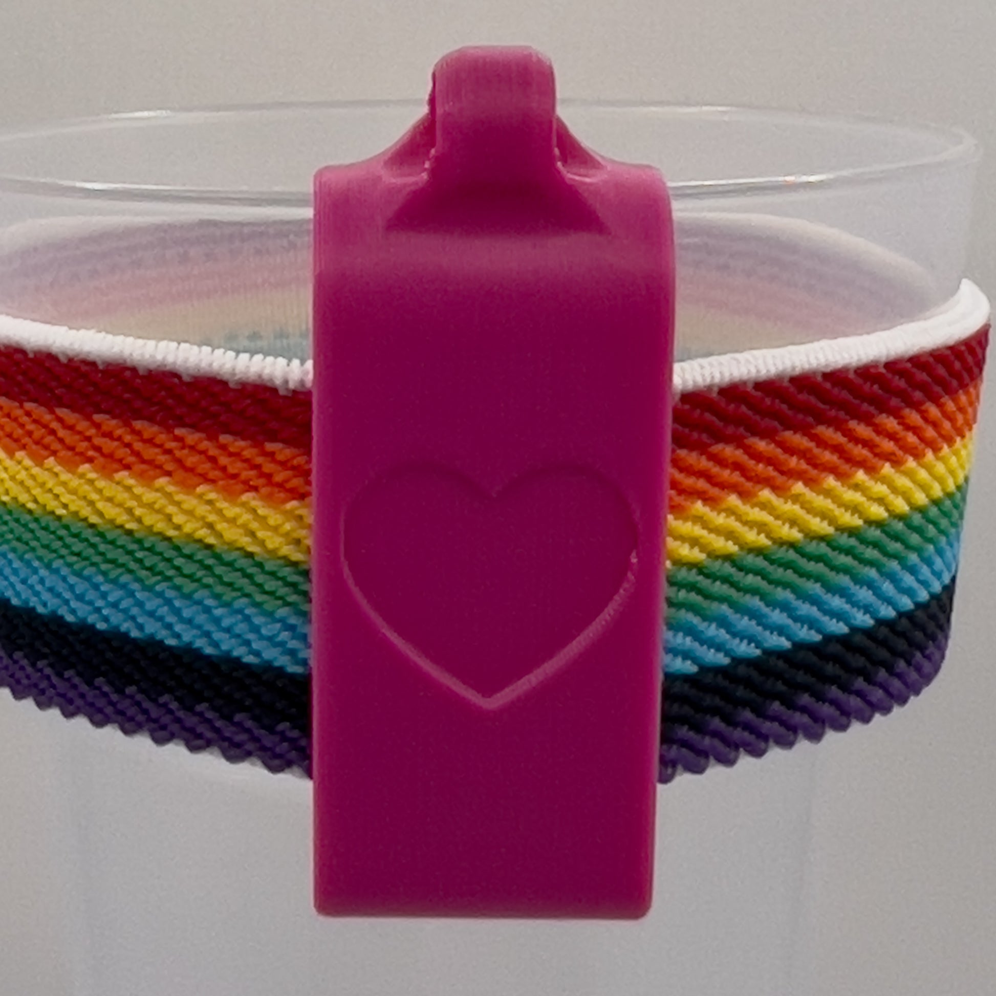 Deze Clip A Cup is verkrijgbaar in zowel roze als paars en heeft een speciale regenboog elastiek en hart ontwerp; perfect voor pride parades en andere evenementen!